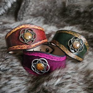 Fabriqué à la main dans mon atelier, ce bracelet viendra orner somptueusement votre tenue de la vie quotidienne ou votre tenue médiévale avec brio. Ce bracelet est réalisé en cuir à tannage végétal et teint à la main. D’une largeur de 4cm et non teint au verso afin d’éviter tout risque d’allergie ; Il est réglable en trois tailles 17-18,5-21cm à fermeture par bouton de col.