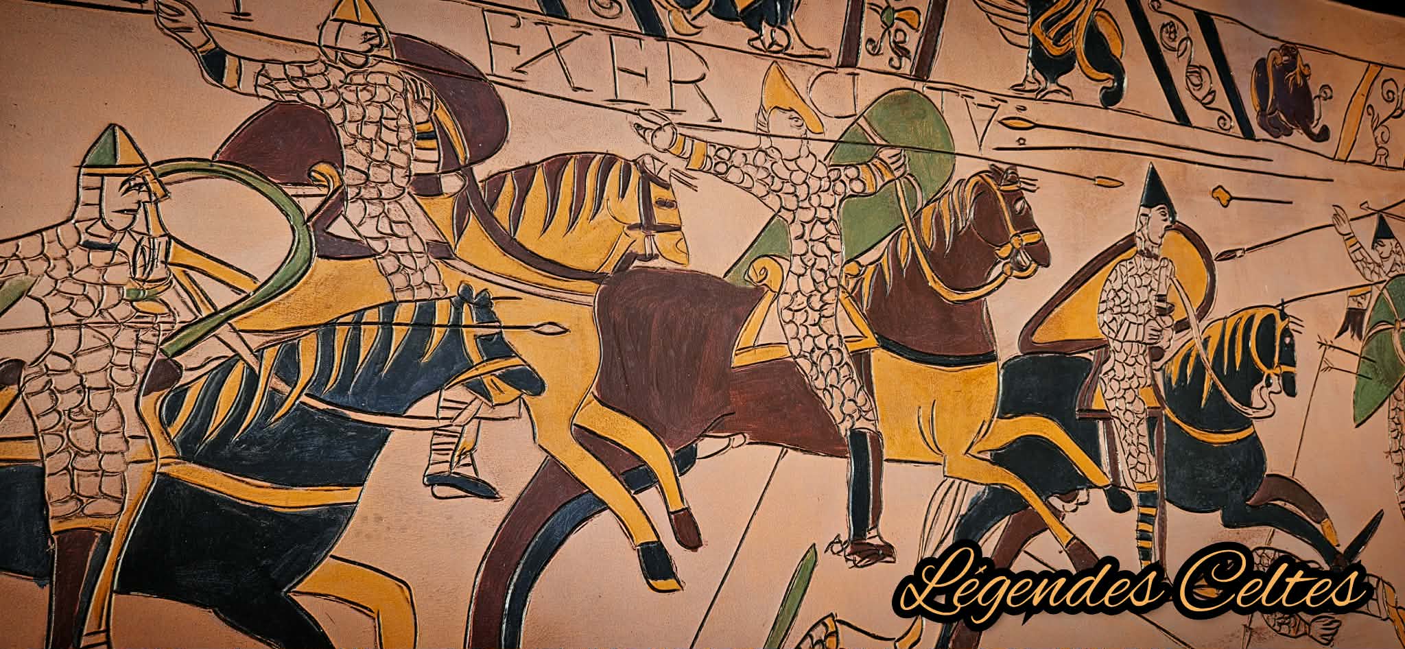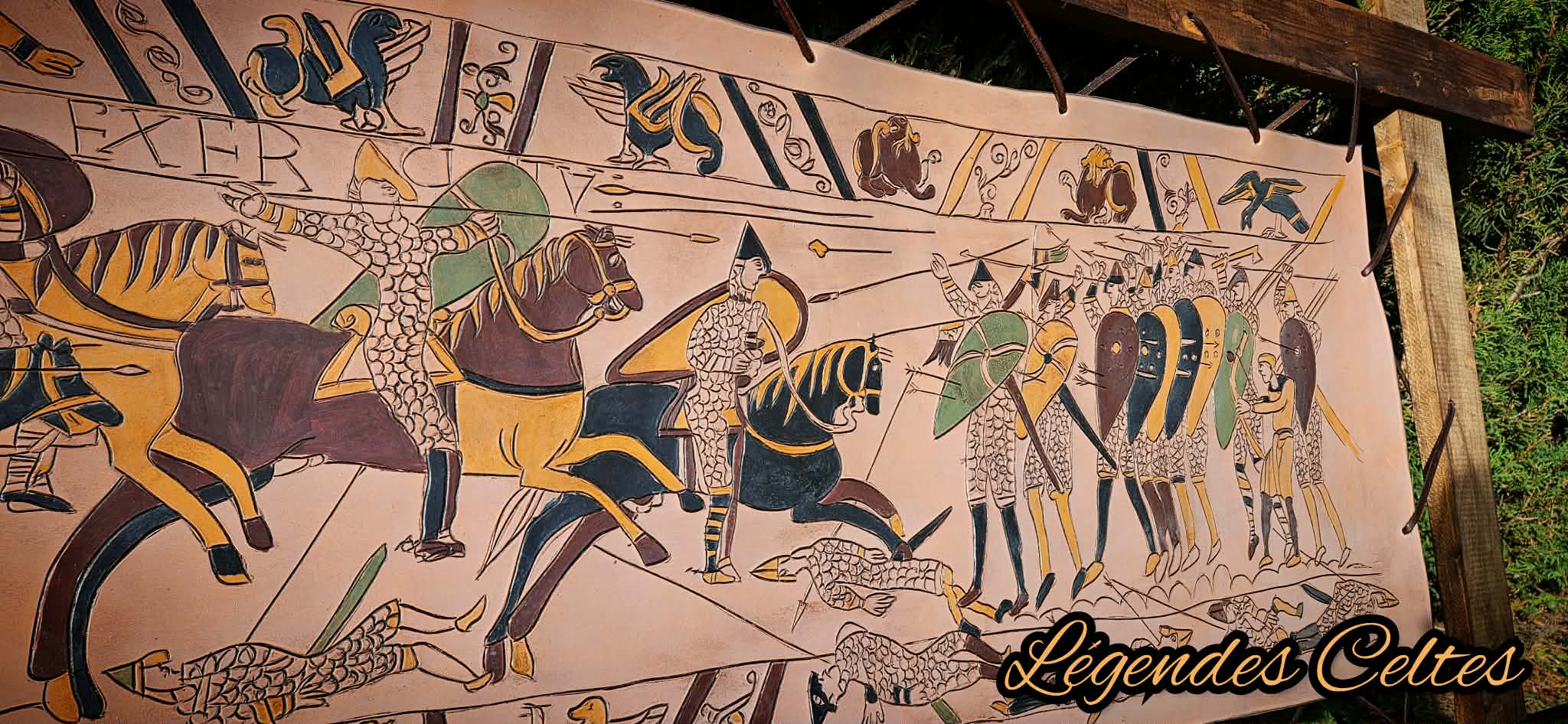 La tapisserie de Bayeux est partie en Angleterre alors j’ai décidé d’en refaire un scène sur cuir correspondant à la scène 51 de la bataille d’Hastings en cuir à tannage végétal.